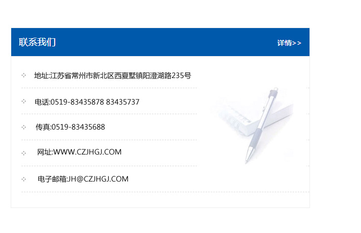 地址:常州市新北區(qū)友邦商務(wù)大廈1幢16、17層  電話:0519-85101652  傳真:0519-85112595  郵編:213022  網(wǎng)址:www_cz-jiayue_cn.sdaolida.com  郵箱:xiajifengaa@163.com